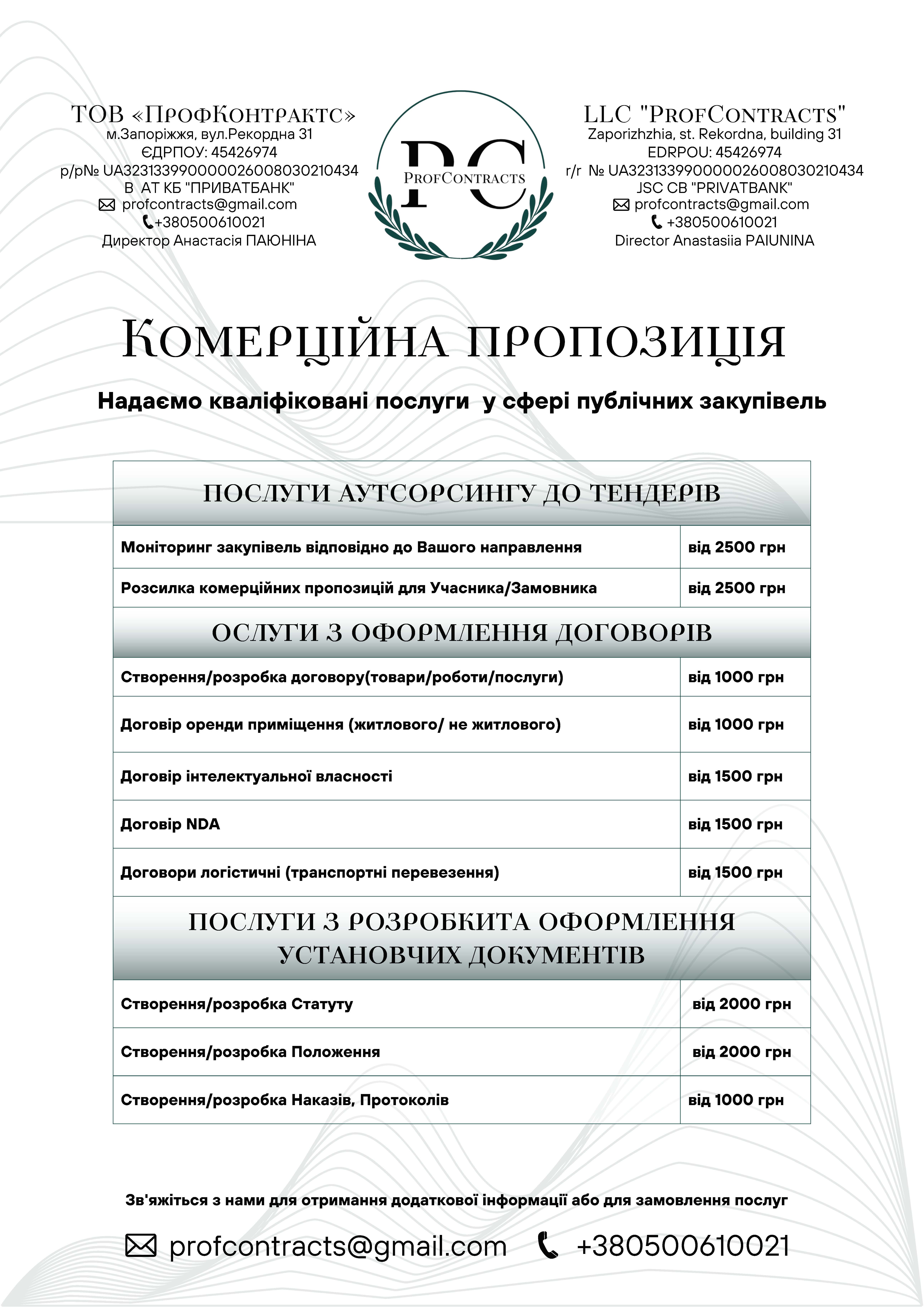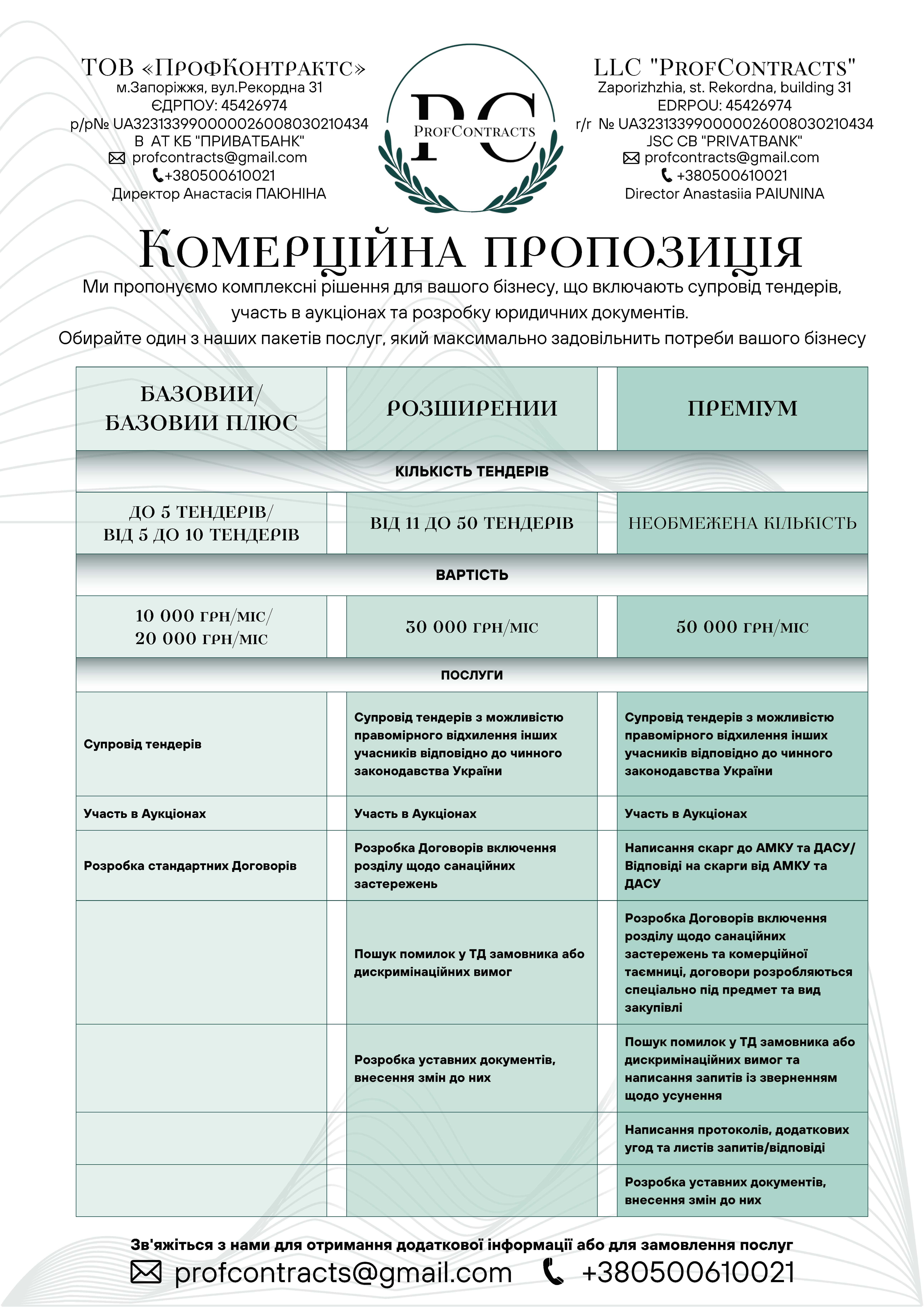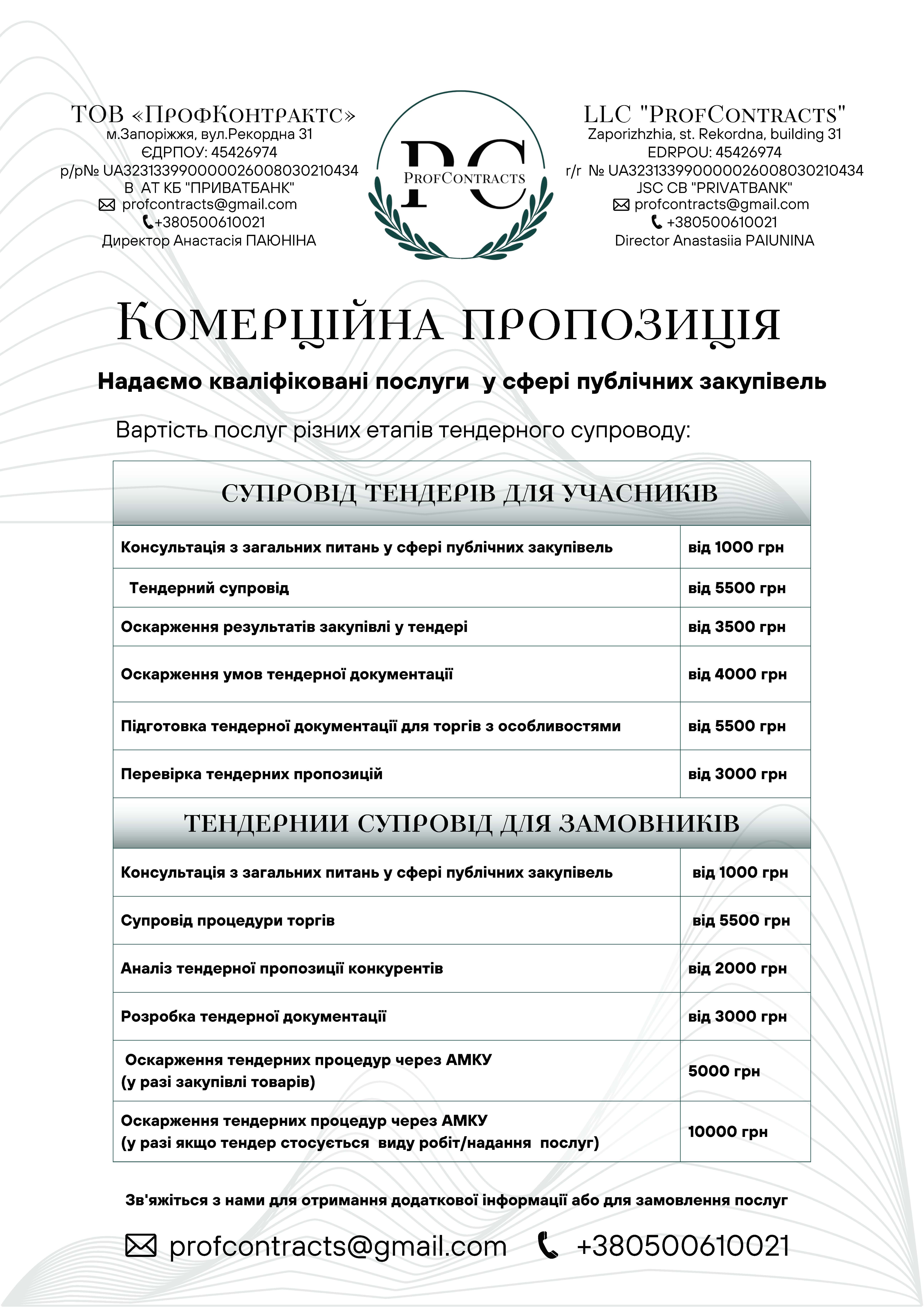 Профконтрактс — провідна компанія, яка спеціалізується на тендерних закупівлях, забезпечуючи ефективне та прозоре управління процесами закупівель для бізнесів різного масштабу та державних установ.